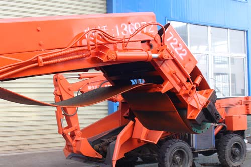 5、本機(jī)采用電動全液壓傳動,液壓行走、挖掘采集、輸送、裝車四種功能,機(jī)構(gòu)緊湊,推進(jìn)力大,扒取范圍廣,可以全斷面裝巖,不留死角,不需人工輔助清理工作面